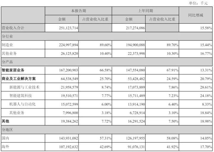 美的2025年上半年来自智能家居业务收入为1672亿元,较上年同期的1475.54亿元增长13.31%,占营收的比例为66.58%。