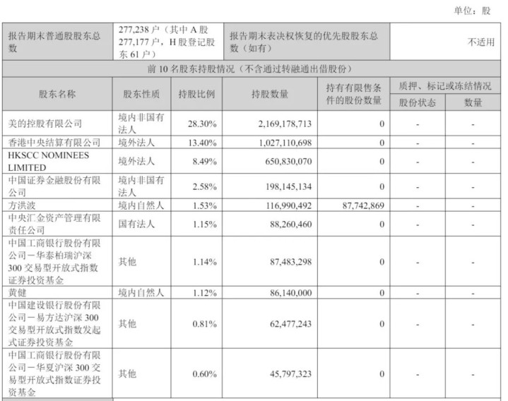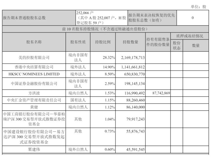 截至2025年6月30日,美的控股持股28.3%,香港中央结算有限公司持股13.4%,HKSCC NOMINEES LIMITED持股为8.49%,中国证券金融股份有限公司持股2.58%,方洪波持股1.53%,中央汇金资产管理有限责任公司持股1.15%,中国工商银行股份有限公司-华泰柏瑞沪深 300交易型开放式指数证券投资基金持股1.14%,黄健持股1.12%;